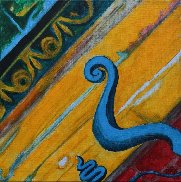 One of my later Bridgwater circle paintings. The picture was taken at the back gate of the town’s library. Taken with the lovely forged metal gate and warm sandstone background – little decorative details which enliven our world and bring a smile