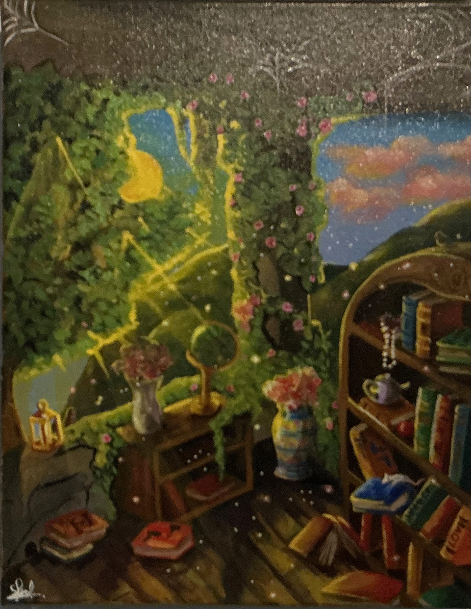 Gallery Main : Painting : Mystical : Morning Library Sold Morning Library By Simone Samuel Out of stock Category: Mystical Tag: sold Information Specifications Oil on canvas. Varnished Weight .300 kg Dimensions 28 × 36 cm Related products Swan Family Sold Moonlight duelSee more Shroom Magic