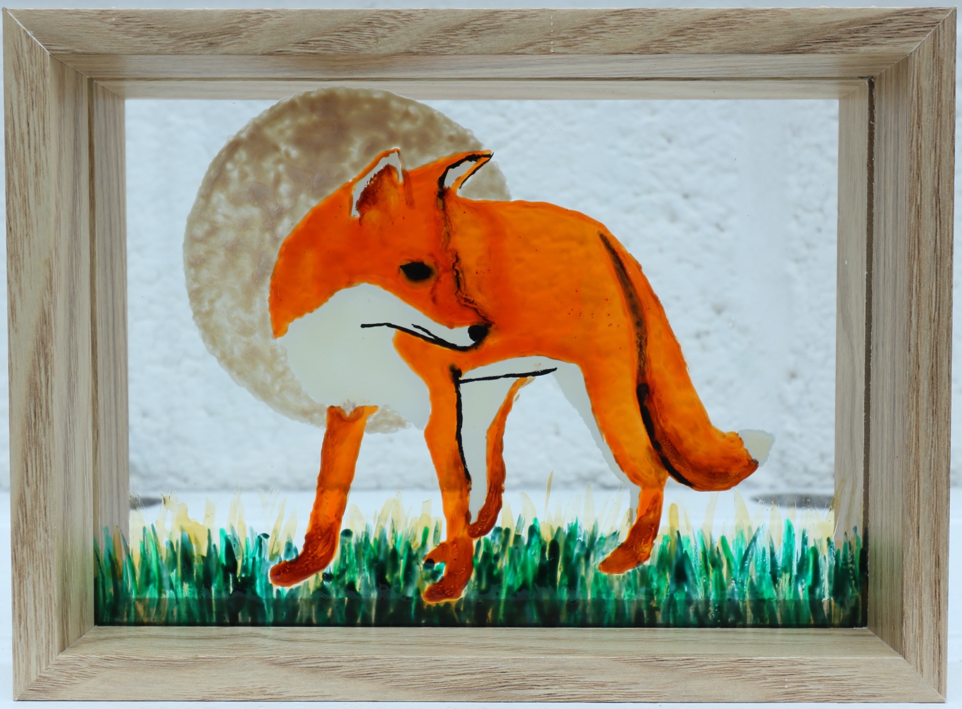 Gallery Main : Garage Gallery Exhibition : Garage Gallery Archive : Art by Nicky : Painted Moonlit Fox on Glass Painted Moonlit Fox on Glass By Nicky Farrell Out of stock Category: Art by Nicky Information Specifications Framed painted glass Dimensions 24.3 × 19.4 × 3.4 cm Related products Painted Hedgehog on glassSee more Black and White Highland CowSee more Badger PortraitSee more