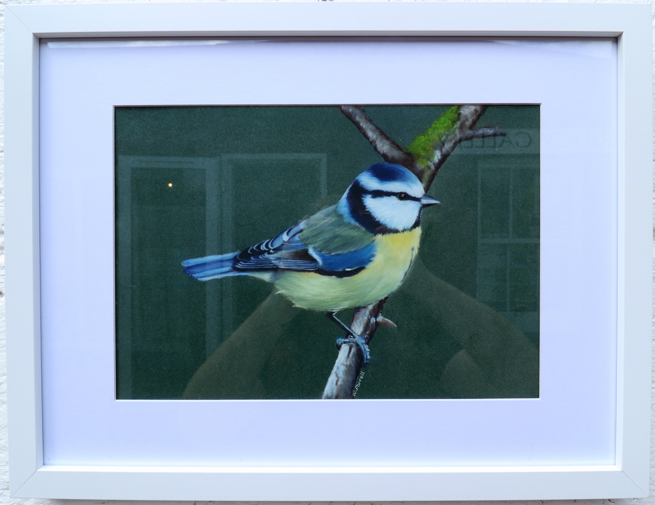 Gallery Main : Garage Gallery Exhibition : Garage Gallery Archive : Art by Nicky : Perched Blue Tit Perched Blue Tit By Nicky Farrell Out of stock Category: Art by Nicky Information Specifications Framed pastels Dimensions 43 × 33 cm Related products FawnSee more Painted Wolf Silhouette on glassSee more Black and Gold BeeSee more
