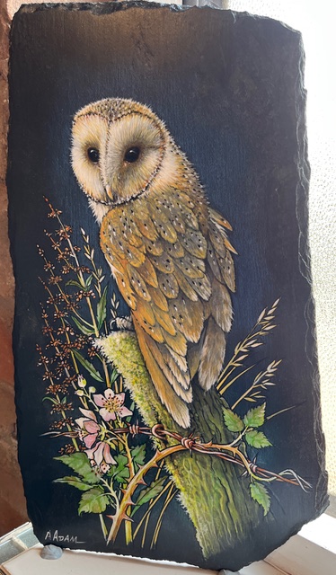 Gallery Main : Garage Gallery Exhibition : Garage Gallery Archive : All Things Bright and Beautiful – Andrew Adam & Des Fox : Andrew Adam : Slate Barn Owl Slate Barn Owl£95.00 By Andrew Adam Out of stock Category: Andrew Adam Information Specifications Acrylic on slate Weight 1.2 kg Dimensions 21 × 36.5 cm Related products Feeding time Harvest Mouse I’m lostSee more Artist at workSee more