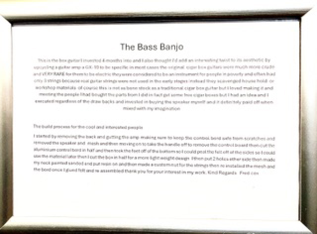 Gallery Main : Garage Gallery Exhibition : Garage Gallery Archive : Self Expression by students from UCS College Group : The Bass Banjo The Bass Banjo By Fred Cox Out of stock Category: Self Expression by students from UCS College Group Information Specifications Come and have a look in the gallery. Work is not for sale. Related products PhotographsSee more BullSee more AbbysSee more