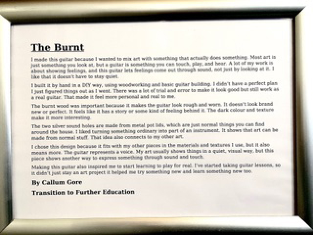 Gallery Main : Garage Gallery Exhibition : Garage Gallery Archive : Self Expression by students from UCS College Group : The Burnt Guitar The Burnt Guitar By Callum Gore Out of stock Category: Self Expression by students from UCS College Group Information Specifications Come and have a look in the gallery. Work is not for sale. Related products Beach topSee more AbbysSee more BullSee more